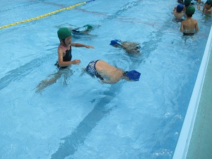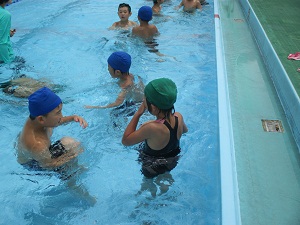 1・2年生の合同体育。今日は浮く技に挑戦。2年生が1年生にお手本を見せたり、補助したりしながら、だるま浮きや伏し浮きをマスターしました。