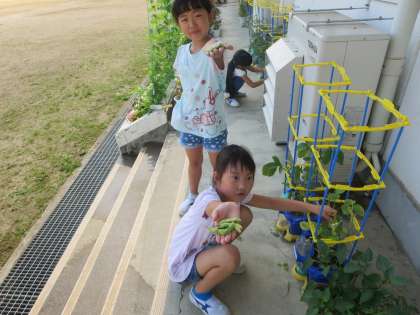 2年生が下校前に育てている野菜の収穫をしていました。そのてのひらにはミニトマトや枝豆がありました。数は少ないけれど、小さな手にはいっぱいの収穫なのです。家に持ち帰って、夕食で家族と食べるという思いもすてきですね。