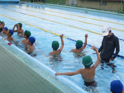 低学年は水泳の授業。できるようになったことをおうちの方に見ていただきました。