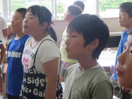 耳に心地よく響く歌声に誘われて中学年教室へ。子どもたちの歌いたいという思いが伸びやかな声となって表現されていたのです。表情や瞳の輝きにも心ひかれたので、パチリしました。
