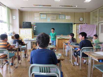 5年教室では「○○さん、ハウアーユー?」「アイムファイン」という感じの健康観察や日直のスピーチをもとにした話し合いなどが行われていました。工夫されているなあと感心しました。