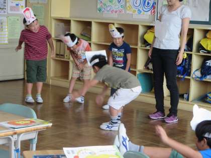 国語の授業では、教室ところ狭しと全身を使った朗読劇に取り組み、