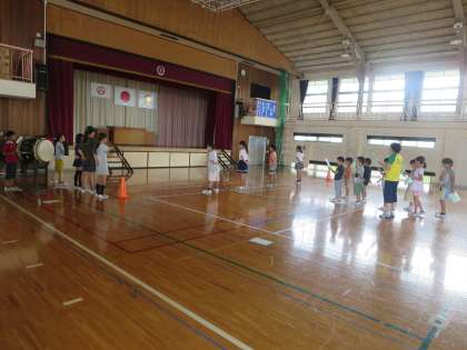 体育館では、4年生、そして2年生が一緒になって練習中でした。午後に行う壮行会の練習です。