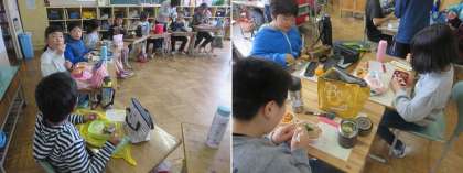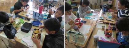 「メニューを考えました」「お買い物をしました」「おかずやごはんをつめました」「(玉子焼き、生姜焼き、チャーハン、みそ汁などを)作りました」などの回答が返ってきました。どんな小さなことでもいいから自分の食べるものに関心をもたせたり考えさせたりするのがねらいですから、OK!ですね。実においしそうに食べる表情もよかったマイ弁当の日となりました。