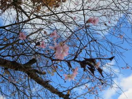 いま各地で「冬のサクラ」が話題になっています。本校でも10/22の記事で紹介したように1本の桜が開花しています。春と比べればすきまだらけではありますが、けなげに咲く姿は美しいです。またすぐ近くにあるイチョウの葉もきれいに色づいています。いまの小泉小校庭、ホントきれいですよ。