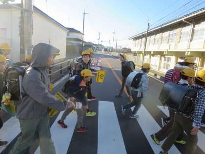 〇寒いのに信号機のボタンを押さず、他の班の到着を待ってくれている子どもたち