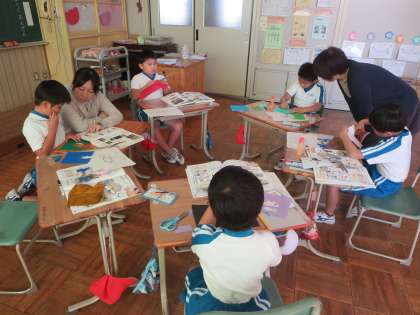 1年教室ではコロコロころがるおもちゃづくりが始まっていました。自分が大好きな動物や昆虫、乗り物を絵にかいたり切り抜いたりしていました。