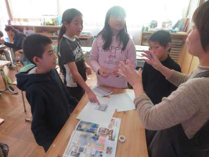 5年教室では学校内で取材した写真をもとに、絵の構成を考えていました。一人一人の発想をさらにふくらませるために、先生と子どもたちが本気になって対話していました。