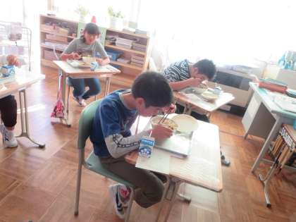ラーメンの汁の中にはたくさんの種類の食材が入っています。栄養満点のラーメンをおいしそうにほおばる子どもたち。その食べっぷりは見ていて気持ちよいです。ふかし芋のやさしい甘さがまたいいんですね。