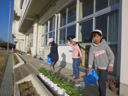 また、鉢植えや花壇の花への水あげも一緒に、一所懸命です。今朝も、子どもたちから元気をもらいました。