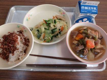麦ごはん、牛乳、野菜のうま煮、かつお手づくりふりかけ、笹かまと野菜のあえものでした。