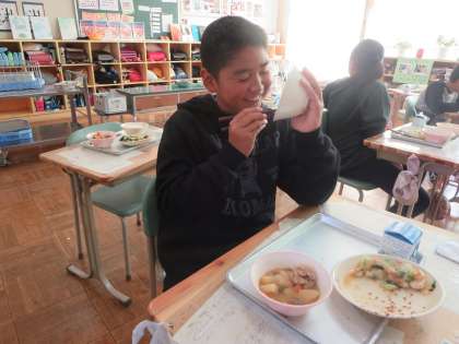いつもどおり子どもたちはしっかり食べていますが、今日は特にご飯の盛りがよかったようです。それは手づくりふりかけを食べたかったからなのです。