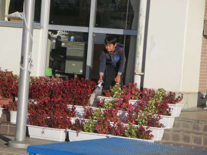 学校では、鉢植えや花壇への水あげがしっかりと行われています。子どもたちもすてきに輝く朝です。