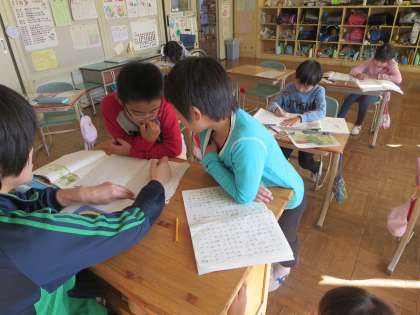 2年教室では国語の授業が行われていました。でも近くによるとノートをかくす子どもたち。執筆中の物語が完成するまでは見せたくないおさなごころなのです。