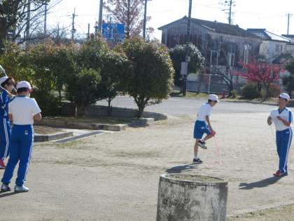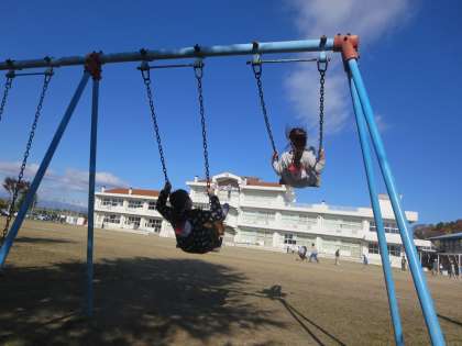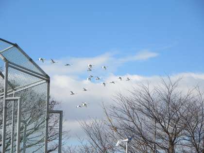 気持ちよさそうに飛んでいく白鳥たち。小泉っ子も思い思いの遊びに夢中です。今日はあたたかで、校庭に立ってひなたぼっこをしているだけでもいい気持ちですが、なわとびに取り組む子どもの姿が見られる季節となったのですね。