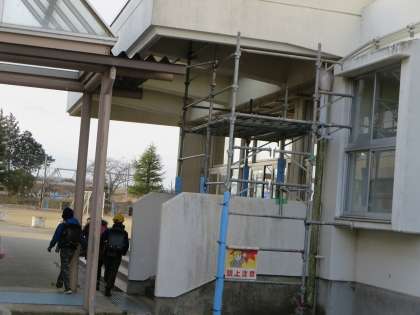 児童玄関わき体育館通路の雨どい工事が始まるので、工事用足場が組まれています。子どもたちが安全に通行するよう気を付けてみていきます。