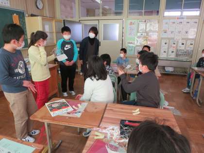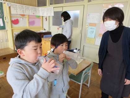 1年生は、しくみの動きを見せたくて、ペットボトルに一所懸命息を吹き込んでいました。5年生は、作った針金作品の鑑賞会。友達作品のすてきなところを紹介し合っていました。