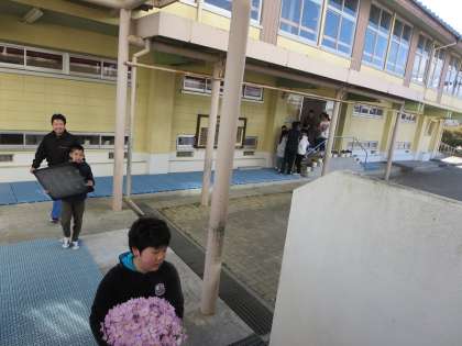 朝の運動が終わると、5・6年生たちが式で使用した鉢花や掲示ボードなどの移動を行いました。進んでやる自主性、共に助け合う思いやり、このよさを学習や活動で十分に発揮できるよう育てていきたいです。