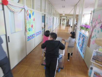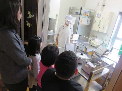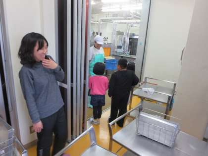 食べた後は、食器を給食ワゴンに乗せて返却する旅が待っています。給食室では心を込めて「ごちそうさまでした」とあいさつすることができました。きちんとできたごほうび?に、特別に調理室をのぞかせていただきました。明日も楽しみですね。