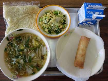 みそラーメン、牛乳、春巻き、茎立ち菜とたまごのあえものでした。