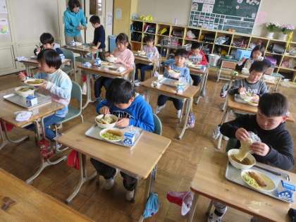今日はラーメン!と朝からうれしそうに話している子どもを見かけました。教室を訪問すると、無心にほおばる、すする姿が見られました。おいしそうに食べるのはよいですが健康も大切です。「ラーメンは飲み物じゃないですよ」「しっかりとかみましょうね」と指導する先生、ナイスです。