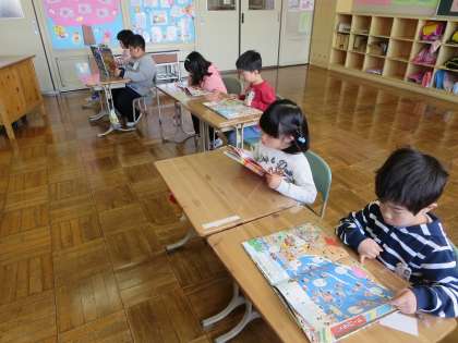 1年生。図書オリエンテーションを行い、自分の読みたい本を選んできたようです。自分一人で学習に向かう学び方を学び始めたところですね。