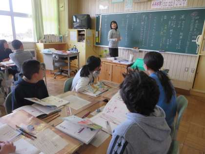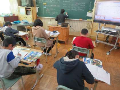 6年国語のワンシーン。班の一人一人が一場面の話を作り、それをつないで物語にする学習を行っていました。考えたことを分かりやすく伝えようとする、相手の言いたいことをくみ取るなど、学び合う力の育ちが感じられました。