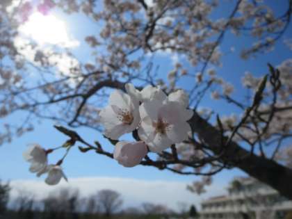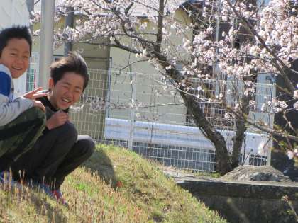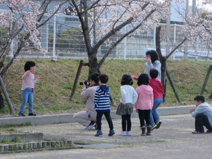 校庭のサクラがきれいに咲き誇っています。日差しも出てきたので、校庭のサクラの木の周りでは、学級集合写真や個人写真の撮影を行いました。しかし、今日は風が強かったので、思わず目をつぶって取り直すこともありました…。