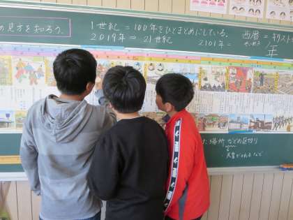 授業後に黒板前で語り合う子どもの姿を発見。そおっと聞き耳を立ててみると、年表に記載された出来事について互いの知識を披露しあっていたのです。その表情は楽しそうでしたし、口調も熱がこもっていて「いいね!」でした。