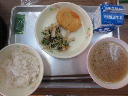 麦ご飯、牛乳、野菜コロッケ、ごまあえ、とん汁でした。