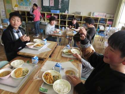 午前中に体育や遊びで思いっきり動き回った小泉っ子です。休み時間の時から「早く食べた〜い」という声が上がっていました。だから配膳が終わると、もりもり、パクパクと給食に向かっていたのですね。サービスのコロッケ増量に歓声を上げながら、気持ちのよい食べっぷりでありました。