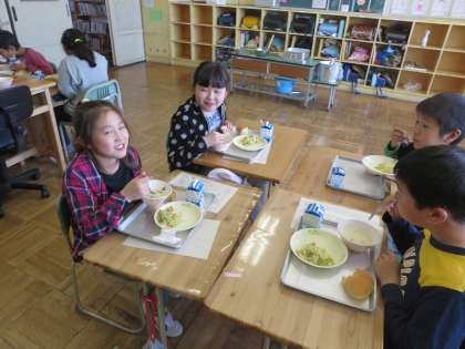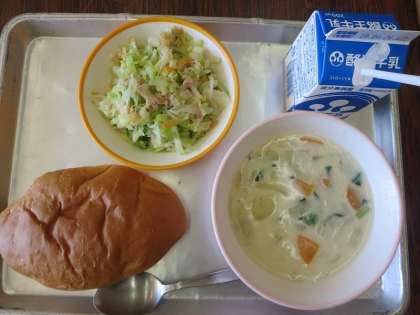 バターロール、牛乳、ホワイトシチュー、ツナサラダでした。気温が高いときにアツアツのシチューは…合うんです!うれしそうにスプーンですすり、ちぎったパンをつけて食する子どもの表情は実にしあわせそうでした。
