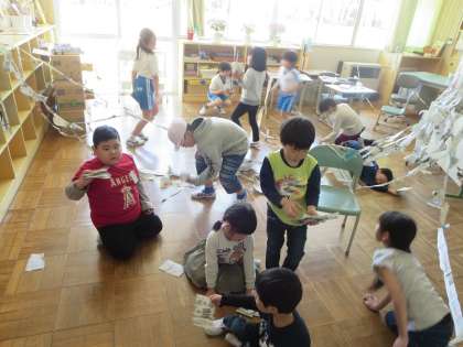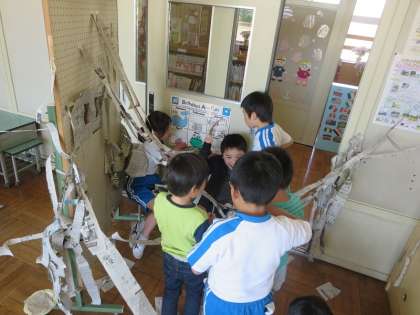 だからお昼休みの1階教室には、たくさんの子どもたちが訪れ、新聞紙アートの中での楽しいひとときを過ごしたのでした。