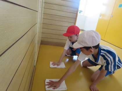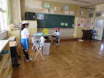縦割り清掃に新たな家族、1年生が加わりました。お兄さんやお姉さんの姿を見てまねようとする姿がすてきです。一緒に、一所懸命、床ふきや机はこびなどに取り組んでいました。