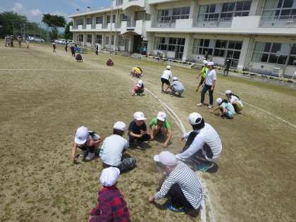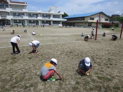 鼓笛の練習が早く終わったので、教職員と子どもたちとで草取りを行いました。土の中はまだ水分が多く、やや抜きづらいのですが、「少しでもきれいな校庭にしたい」とあきらめずにがんばりました。