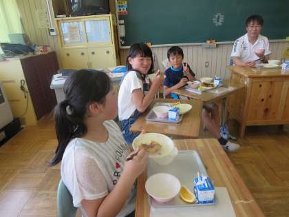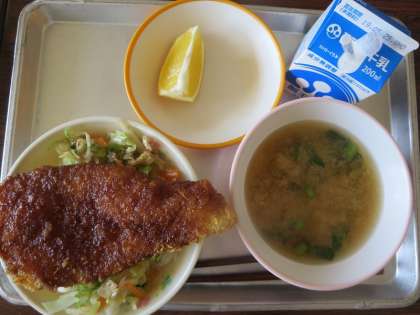 ごはんの上にキャベツ、そしてカツをのせて丼にする子、ご飯とは別にカツレツとしていただく子など、好みはそれぞれですが、みんな大満足の給食となりました。