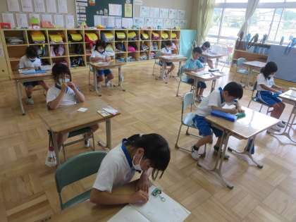 1年生はお勉強を…ではなく、粘土や折り紙、お絵描きと自分の好きなことに夢中にです。様子を眺めていたら、作ったものや描いたものを次々に紹介してくれました。