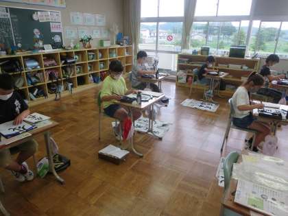 今日も落ち着いて書に向かう5・6年生の姿が見られました。納得のいく字が書けなくて何度も練習する子、手本を見つめイメージを持ってから筆を走らせる子、自分の作品を見比べて課題を見いだす子…。心おだやかに学習する時間をありがたいと思うこの頃です。