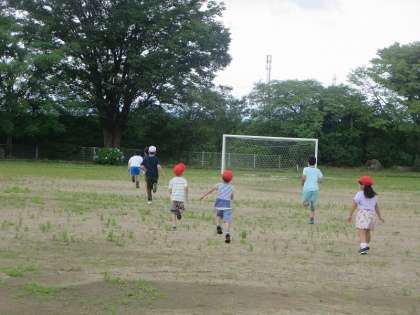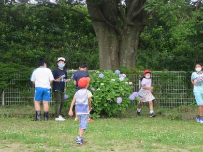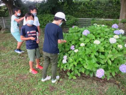 そう、6年生はアジサイのところへ向かい、アルミホイルを取り出して準備を始めました。次の理科の授業に関係しているようです。しばらくは6年生の様子を見ていた1年生でした。黙々と作業する6年生をじーっと見つめる1年生。でも、最後はしびれを切らして6年生を追いかけ始めたのでした。うれしそうに…。