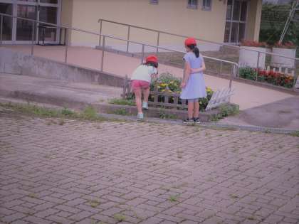 1年生が花だんの前に立ち、真剣なまなざしを向けていました。