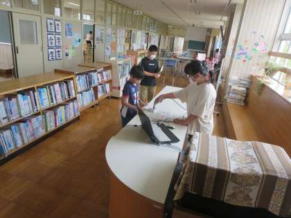 1階・2階の図書コーナーへ行き、本棚をながめながら自分の読みたい本を選ぶ。貸出コーナーで借りたり返したりするときに委員会の子どもと会話をする。教室に戻り自分の机で本のページをめくる。