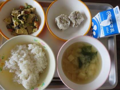 麦ごはん、牛乳、肉シューマイ、ゴーヤの炒め物、わかめ汁でした。