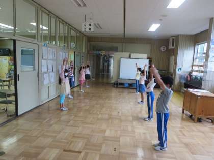 ラジオ体操。お手本を示してくれる2年生の動きを学んで、伸びのある大きな動きができつつあります。3年生もダイナミックな動きぶりでした。