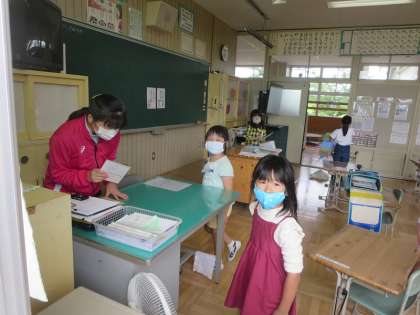 ランドセルの中身を机に入れ、宿題や提出物を上げます。先生との会話も楽しいひとときとなっています。また、換気を意識して教室や廊下の窓開けをする子どもの姿も日常的になりつつあります。