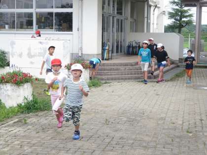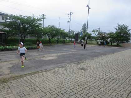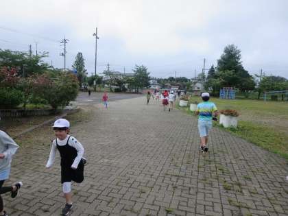 朝の運動をしようと意気込んで出てきたのは3年生。でも校庭はぬかるんでいます。「走りたい」という気持ちに応えるため、インターロッキング・南側駐車場のスペースでのランニングを行うことにしました。密集状況を避けるよう、随時声をかけましたが、上級生が上手に間隔をとって走ってくれるので、それをまねて下級生も走ることができましたね。