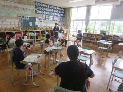 外国語の授業。話す役・聞く役・見る役に分かれ、自分の学校生活を伝え合う活動でした。目的をもってことばをはっきりと話す(聞き取る)学習ができました。