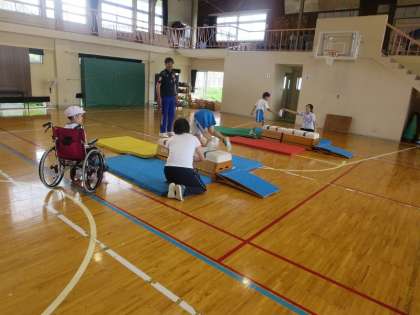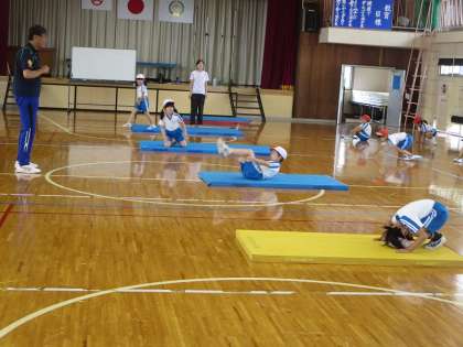 「できるようになりたい」という願いをもってマット運動や跳び箱運動に取り組む小泉っ子。アドバイザーの先生は、やさしいまなざしとあたたかな語り口で分かりやすく教えてくださいました。「今日の子どもたちはすばらしいチャレンジャーでしたね」とおほめのことばもいただきました。ありがとうございました。