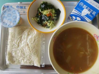 カレーうどん、牛乳、海藻サラダ、ヨーグルトでした。