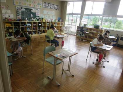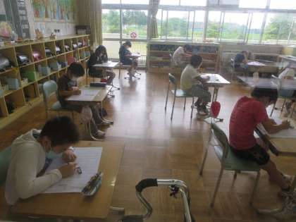 1校時の2階は、いつもと違う雰囲気。ひっそりとしていたのです。6年生は理科室で授業中。だけど4・5年生は教室で授業のはずです。そおっとのぞいてみると…。テスト中でした。しかも寝ていたり、ぽーっとしていたりする子はいません。みんな一所懸命に問題を読み、考え、解答していました。