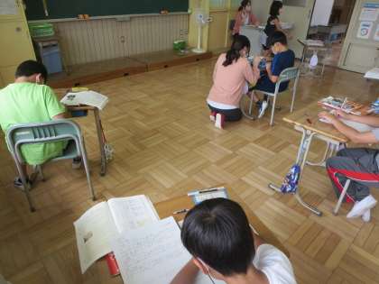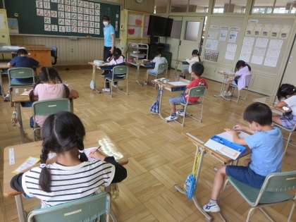 1年生は、ひらがな五十音を書く学習です。プリントに向かう姿を見れば、正しく、ていねいに書こうとしていることが伝わってきました。